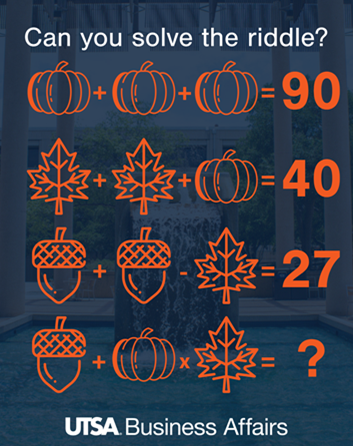 Put on your thinking caps and have some fun with our Business Affairs November Riddle Challenge! Here’s how to play: solve the riddle below and email VPBAOffice@utsa.edu with your answer. If your answer is correct, your name will be entered into a drawing to win a Business Affairs-branded insulated tumbler. We’ll announce the winner in next month’s newsletter!