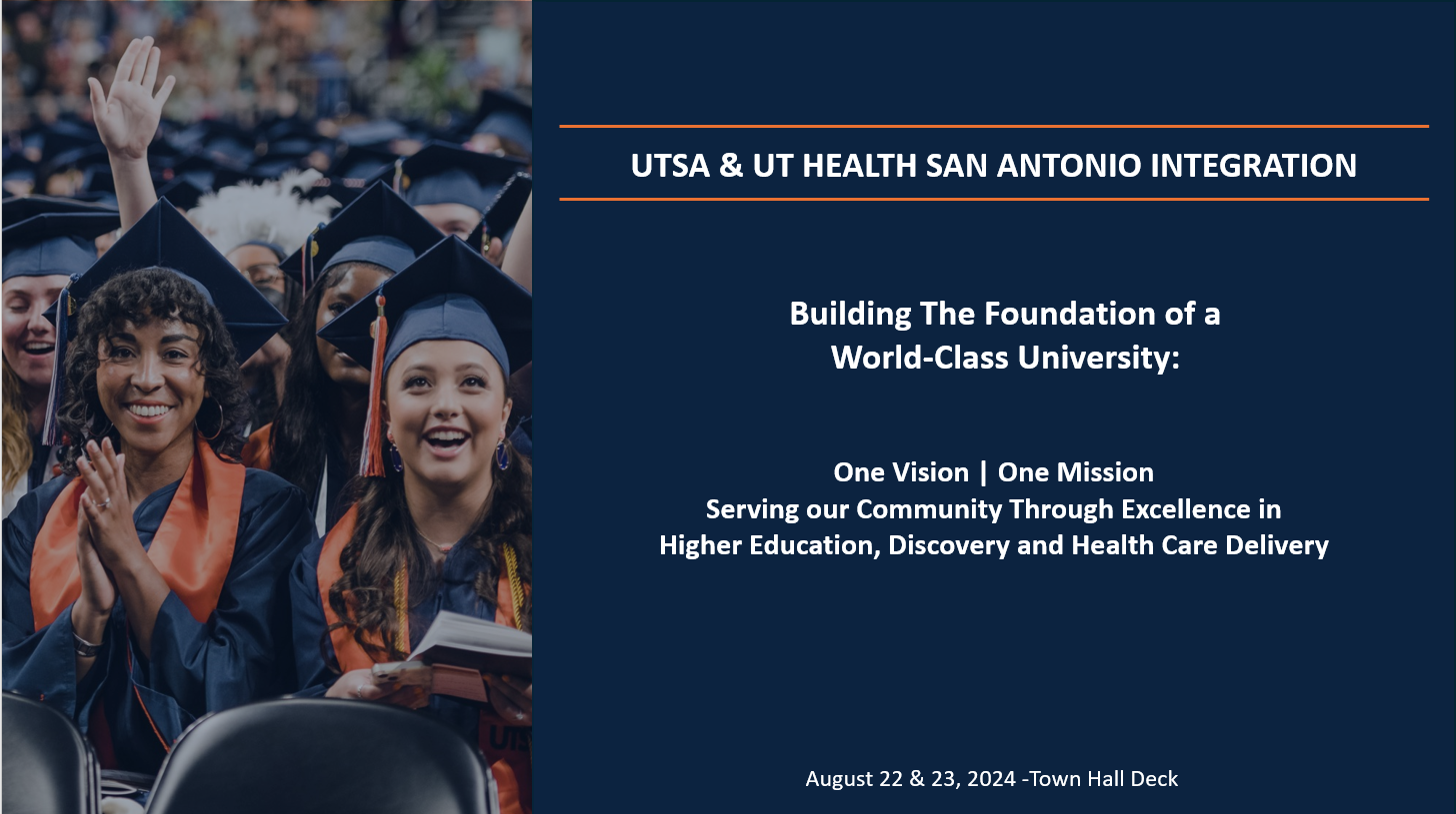 Presentation: President Eighmy and leadership shared the plan to merge UTSA and UT Health San Antonio during Town Hall meetings to faculty and staff on August 22 and 23, 2024.